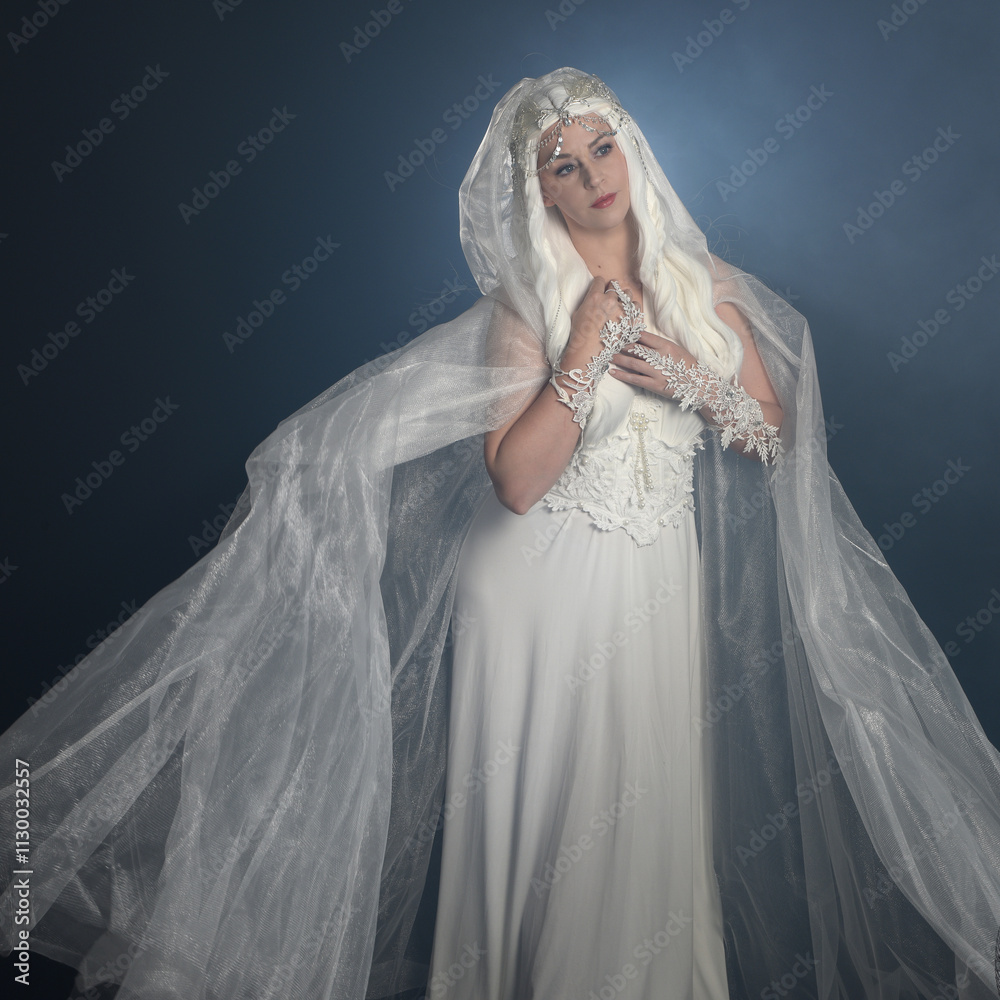 close up portrait of beautiful blonde female model wearing white fantasy snow fairy gown, magical silver crystal queen crown, hooded flowing cloak. Isolated pose on dark studio background.
