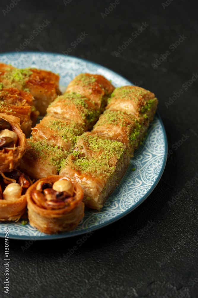 Traditional Middle Eastern sweets served on a decorative plate with pistachio topping