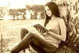 Girl sitting in grass, reading book in summer sun light