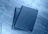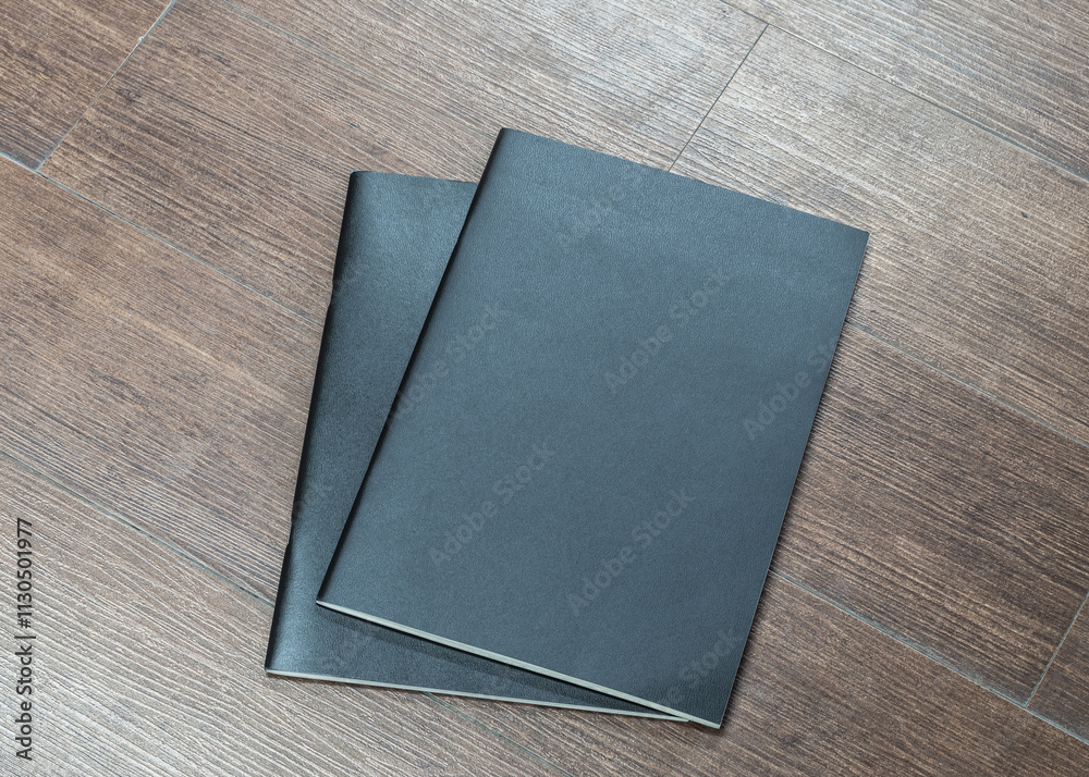 Book mockup blank black A4 leather cover for magazine, booklet, brochure, menu, diary mock-up design template on wooden table background
