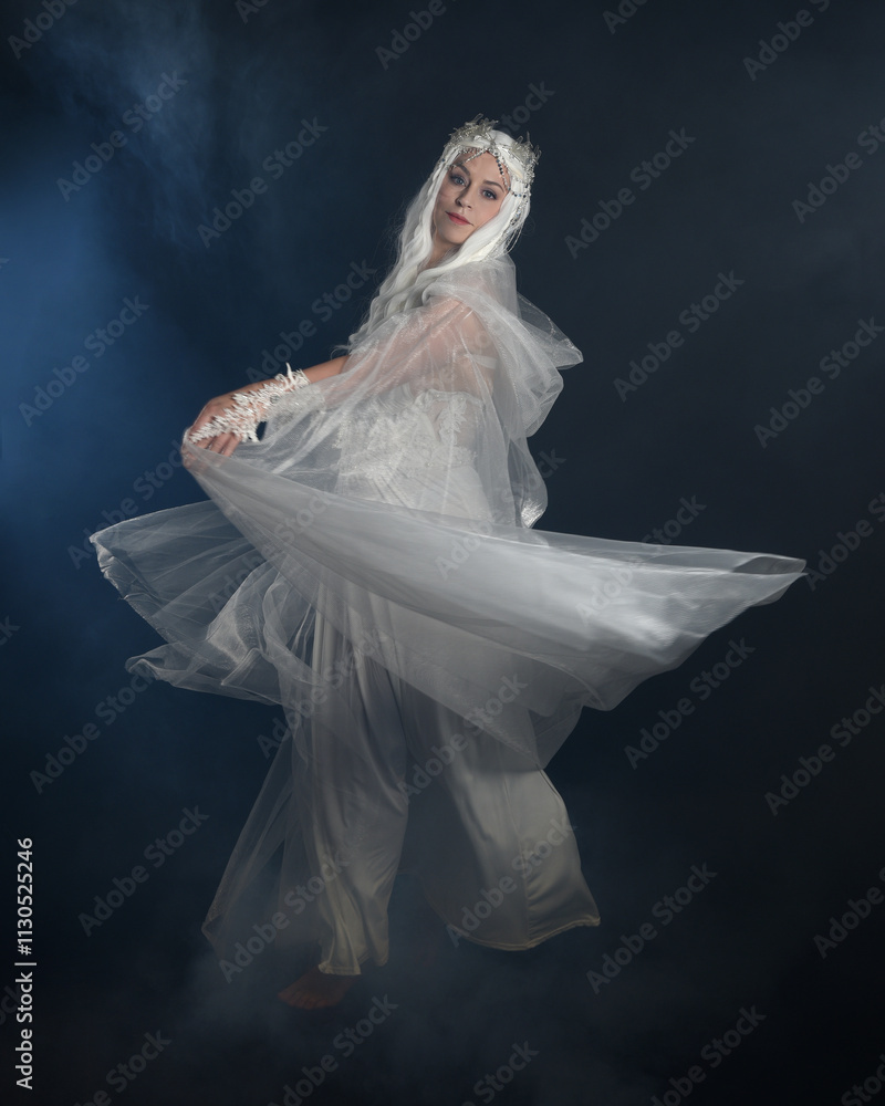 full length portrait of beautiful blonde female model wearing white fantasy snow fairy gown, magical silver crystal queen crown, hooded flowing cloak. Isolated walking pose dark studio background