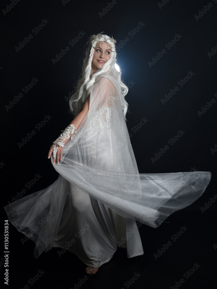 full length portrait of beautiful blonde female model wearing white fantasy snow fairy gown, magical silver crystal queen crown, hooded flowing cloak. Isolated walking pose dark studio background