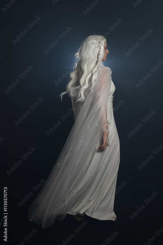 full length portrait of beautiful blonde female model wearing white fantasy snow fairy gown, silver queen crown, hooded cloak. Isolated walking pose, facing away looking back, dark studio background