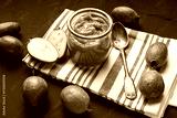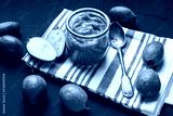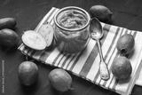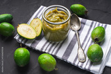 Mashed raw feijoa jam in a glass jar on a white napkin with a spoon and feijoa fruit, a healthy subtropical plant full of vitamin C, grown mainly in Latin America. Black background or table.