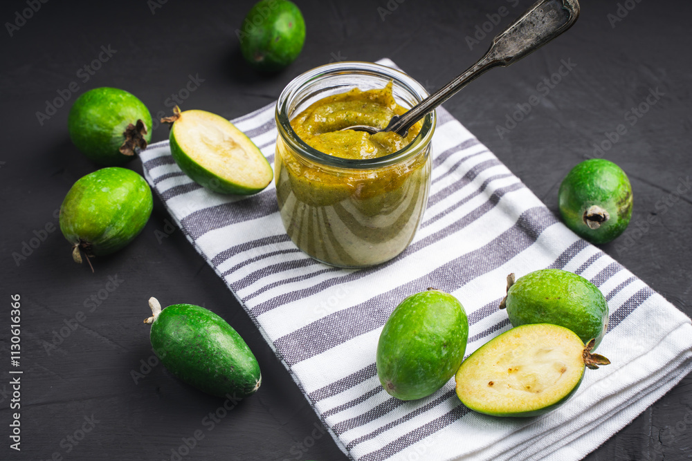 Mashed raw feijoa jam in a glass jar on a white napkin with a spoon and feijoa fruit, a healthy subtropical plant full of vitamin C, grown mainly in Latin America. Black background or table.