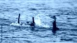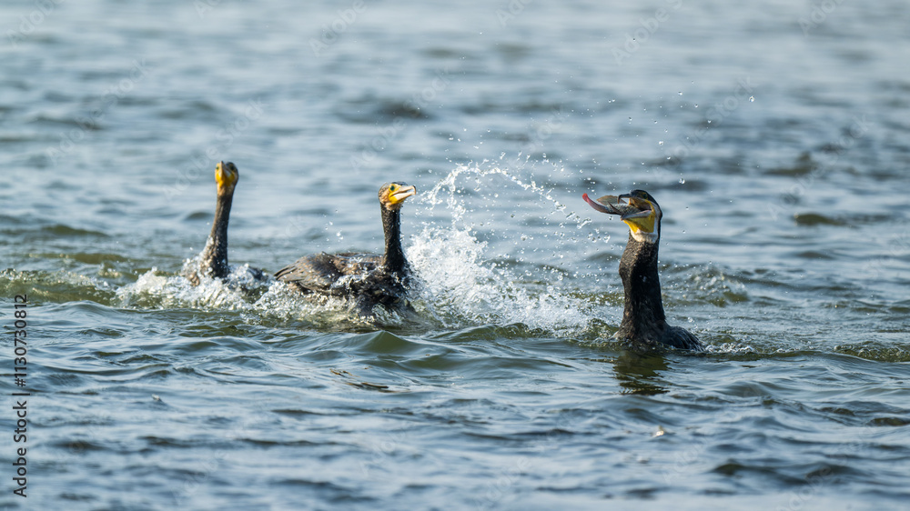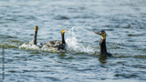cormorants snatching fish in the water.