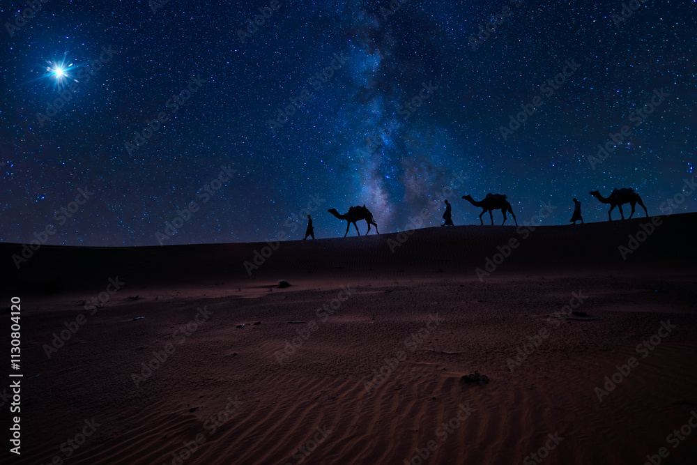 Christmas Jesus birth concept - Adoration of the Magi, Three Wise Men, Three Kings, and the Three biblical Magi with camel silhouettes journeying in sand dunes of desert follow Bethlehem star at night