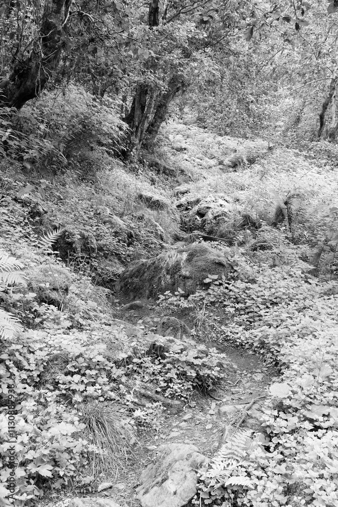 Forest in Norway in Sogn og Fjordane region - black and white retro style photo of Norway