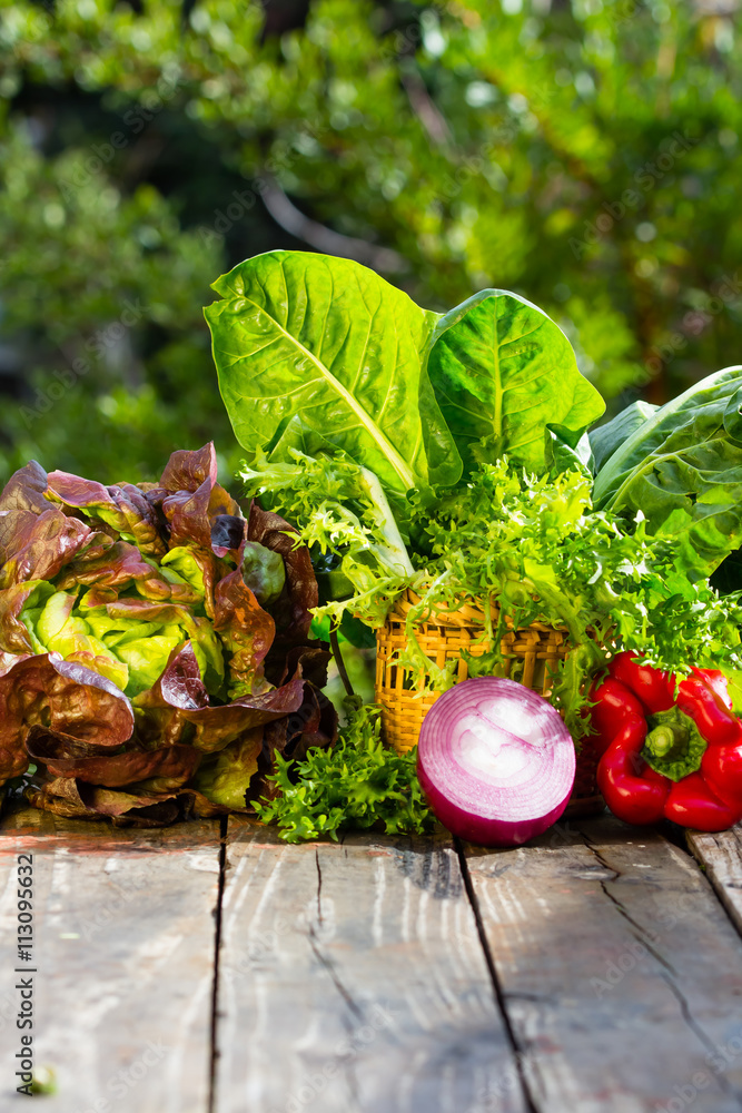Vegetables. Mangold, lettuce, onion, bell pepper over nature background