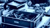 Close Up Shot Of Box With Motherboards From Old Laptops That Are Being Disassembled By Electronics Factory Workers. Process Of Recycling Computer Components For Production Of Modern Microchips.
