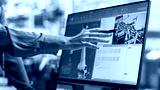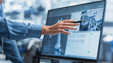 Close-Up On Screen Of Desktop Computer With Automation Software For Autonomous Assembly Line At Modern Factory With Robotic Arms. Technical Supervisor Pointing At Display, Adjusting Production Process