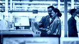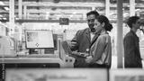 Indian Male Industrial Engineer And Hispanic Female Supervisor Using Laptop And Talking At An Electronics Factory. Man Using Soldering Jet Printer, Explaining Process Behind Production Of Motherboards