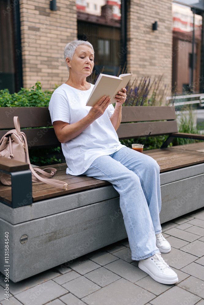 Full length vertical portrait of elegant senior woman sitting on bench, engrossed in captivating book, savoring moment of tranquility with coffee. Happy elderly lady enjoying peaceful moment with book