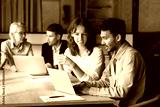 Two multiethnic businesspeople discuss new business platform using laptop, involved in data analysis, reviewing report, or collaborate on project plan, busy in completion work-related task. Teamwork