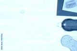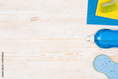 Cleaning items and tools lying on textured white floor background. Frame for cleaning concept or advertising. Empty copy space around products.
