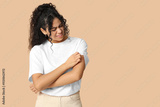 Young African-American woman suffering from skin allergy on beige background