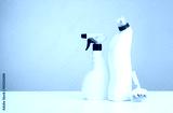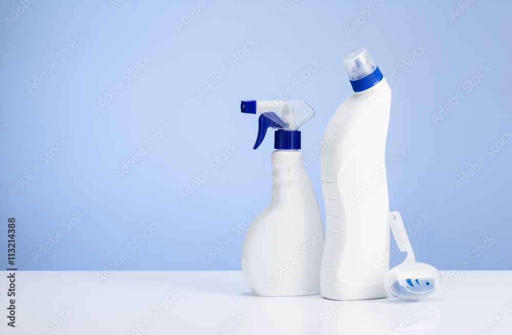 Cleaning concept background. Assorted products isolated on white and blue backdrop. Studio product shot for advertising, website or blog.