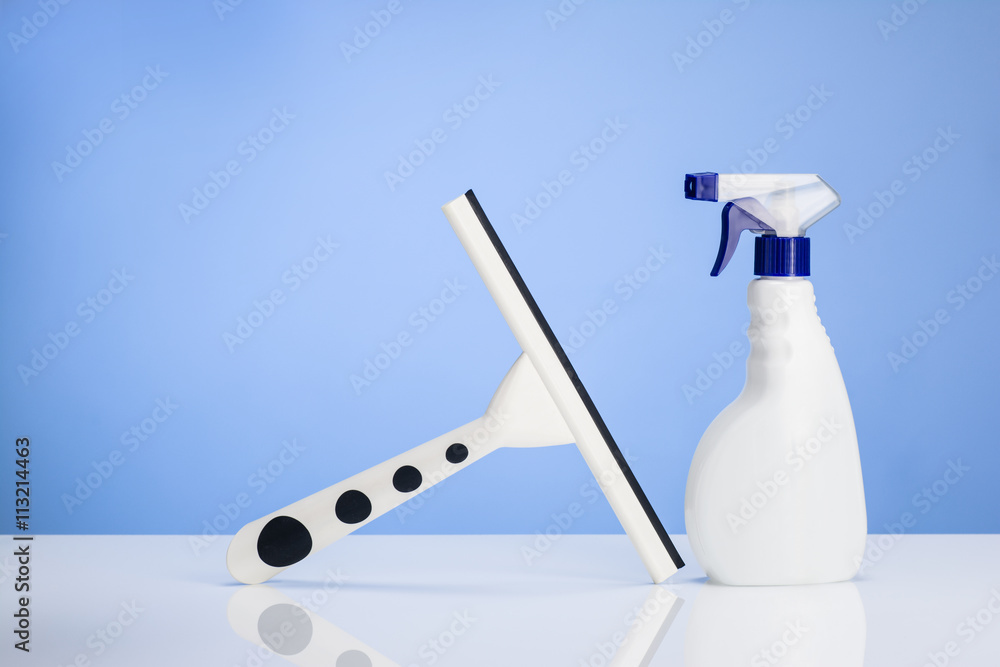 Cleaning concept background. Assorted products isolated on white and blue backdrop. Studio product shot for advertising, website or blog.