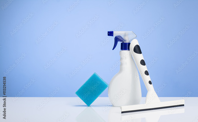 Cleaning concept background. Assorted products isolated on white and blue backdrop. Studio product shot for advertising, website or blog.