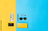 Woman's accessories lying flat on textured fabric background. Blue and yellow pastel colors with copy space around products. Horizontal image or photograph.