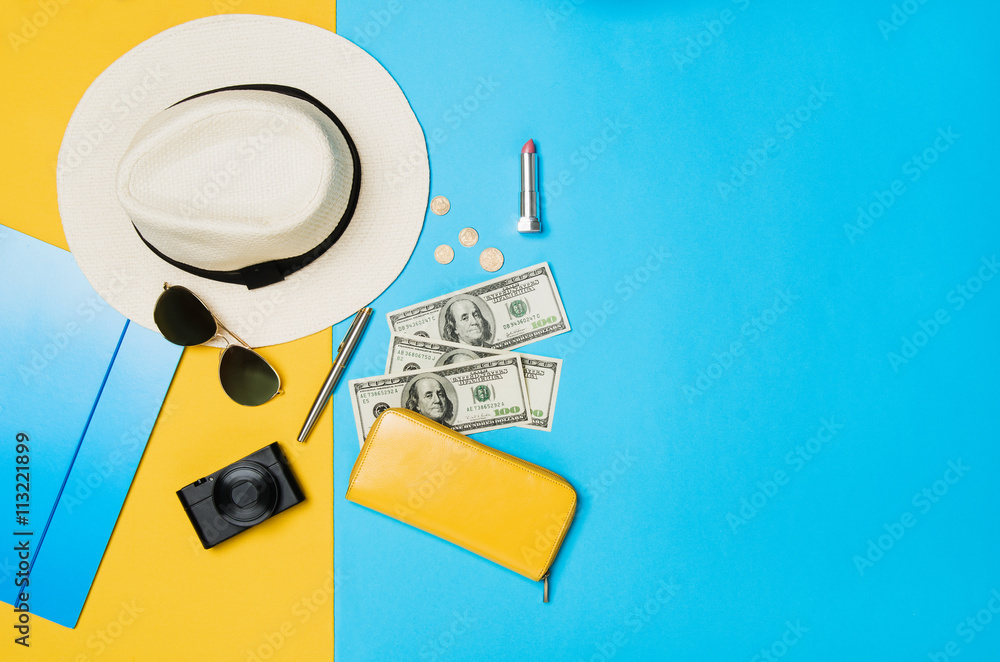 Woman's accessories lying flat on textured fabric background. Blue and yellow pastel colors with copy space around products. Horizontal image or photograph.