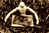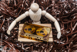 concept of the past, a wooden mannequin surrounded by unwound magnetic tape covers with hands an pallet of goods with audio cassette tape dismantling parts