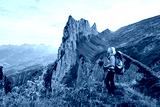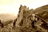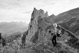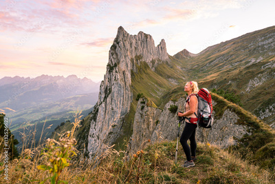 Young woman with backpack hiking in Appenzell Innerrhoden canton of Swiss Alps, Switzerland. Rocky mountain peaks on the background