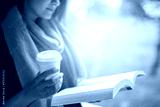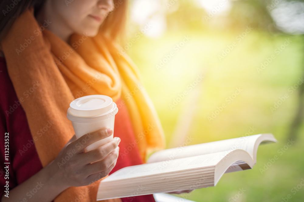 Reading book and drinking coffee outdoors