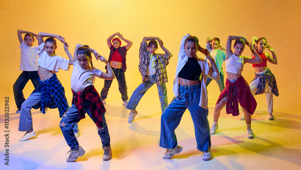 Group of teen girl in stylish clothes, jeans, checkered shirts, dynamically dancing hip hop against yellow background in neon light. Concept of modern dance, youth, active lifestyle, hobby