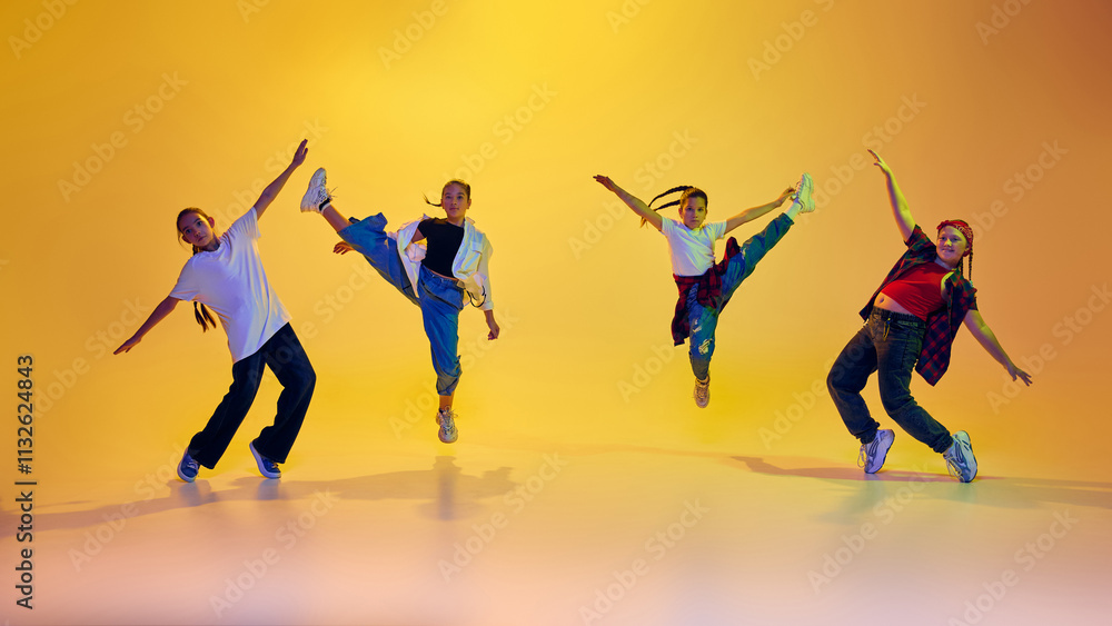 Stylish and active teen girl in casual clothes, dynamically dancing, performing hip hop, training against yellow background in neon light. Concept of modern dance, youth, active lifestyle, hobby