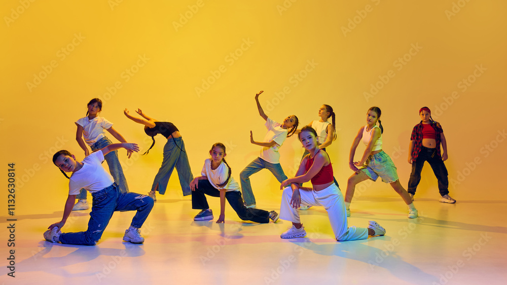 Energy and dynamics. Group of artistic and talented teen girls in casual clothes dancing hip-hop against yellow background in neon light. Concept of modern dance, youth, active lifestyle, hobby