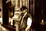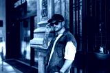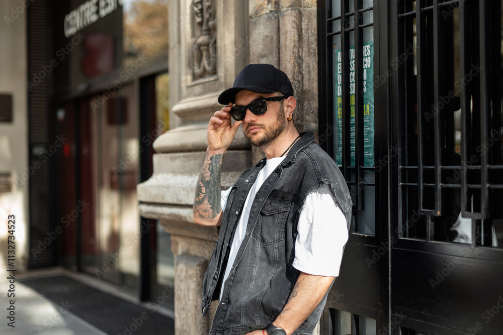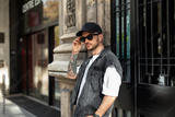 Fashion handsome man with black cap in fashionable denim clothes with denim vest puts on sunglasses and stands near building in Barcelona