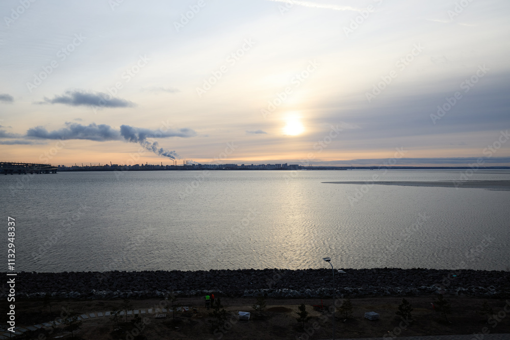 A Tranquil Sunset Over Calm Waters Accompanied by a Modern Industrial Skyline View