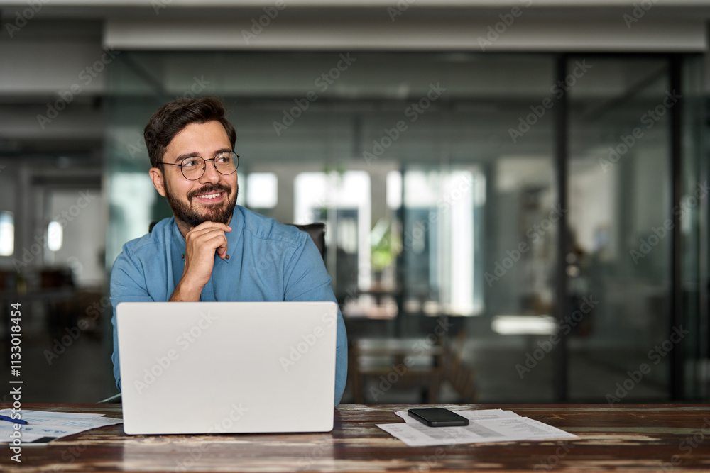 Happy professional business man company employee, young busy smiling male businessman entrepreneur or worker looking away using laptop computer technology working at corporate office desk.