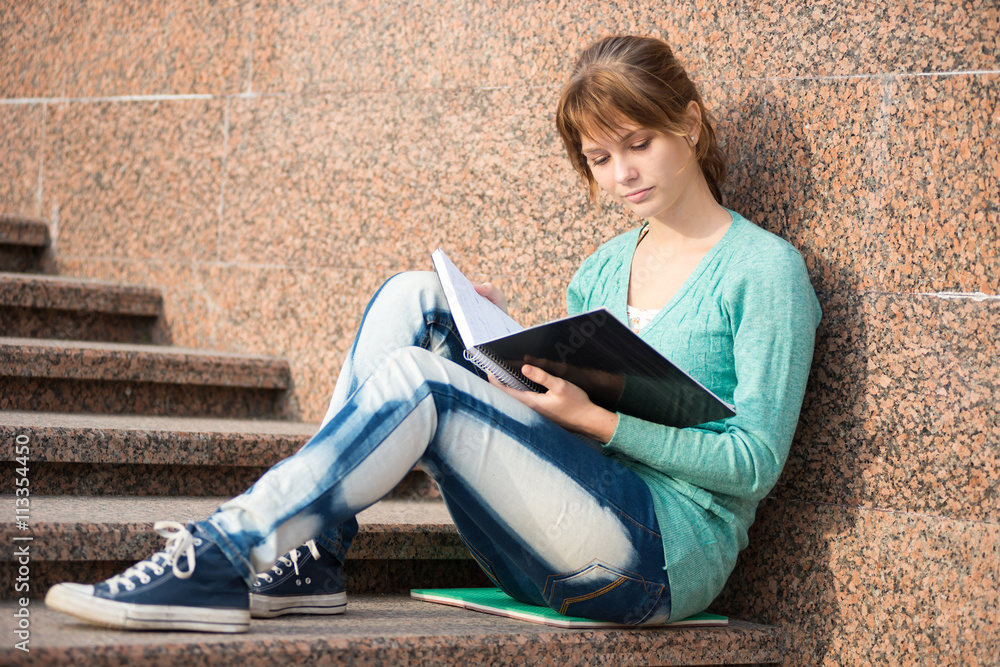 Portrait of a beautiful teenage student girl sitting on stairs in park with copy book and studing. Sunny summer day. Modern and casual lifestyle. Woman with note pad.