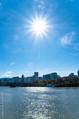 Sun shining Over Portland, Oregon Riverfront Park and Skyline