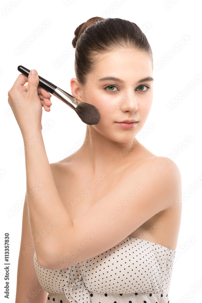 Portrait of beautiful young brunette woman with clean face. Beauty spa model girl with perfect fresh clean skin applying cosmetic brush. Youth and skin care concept. Isolated on a white background.