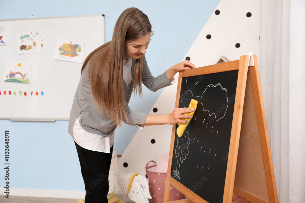 Female nursery teacher wiping chalkboard in kindergarten