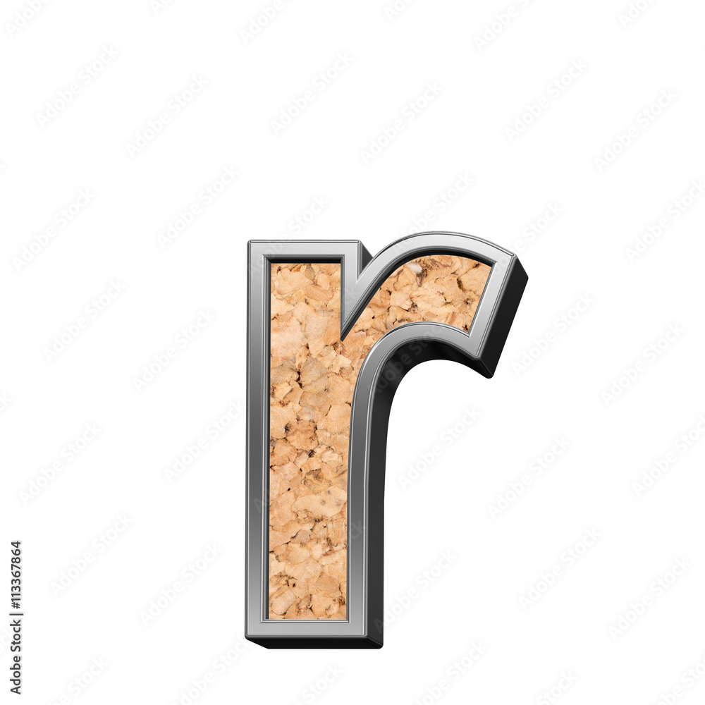 One lower case letter from cork with silver shiny frame alphabet set, isolated on white. 3D illustration.