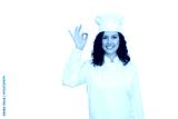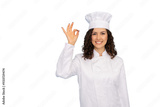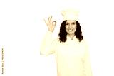 Latina culinary artist wearing a chef’s uniform posing elegantly