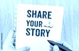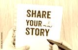 Share your story word on white ring binder notebook with hand ho