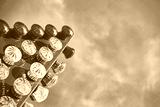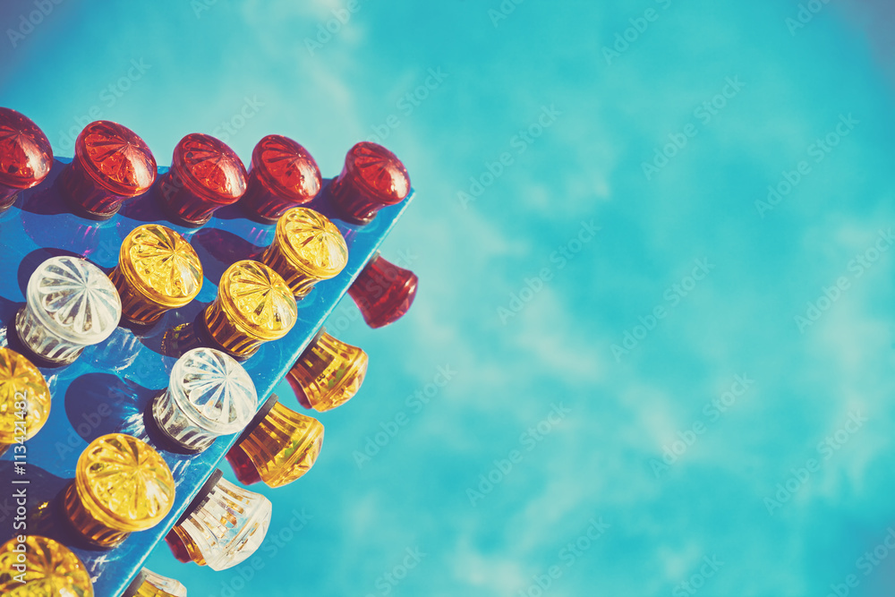 Vintage toned background made of colorful light bulbs close up in an amusement park, shallow depth of field.