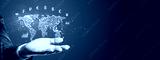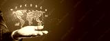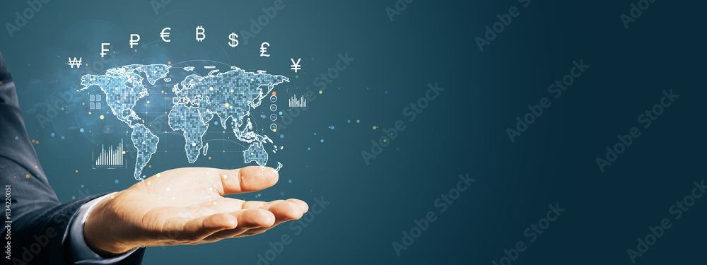 Digital world map with currency symbols floating over a hand on dark background. Concept of global finance, transactions, and fintech.