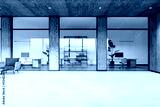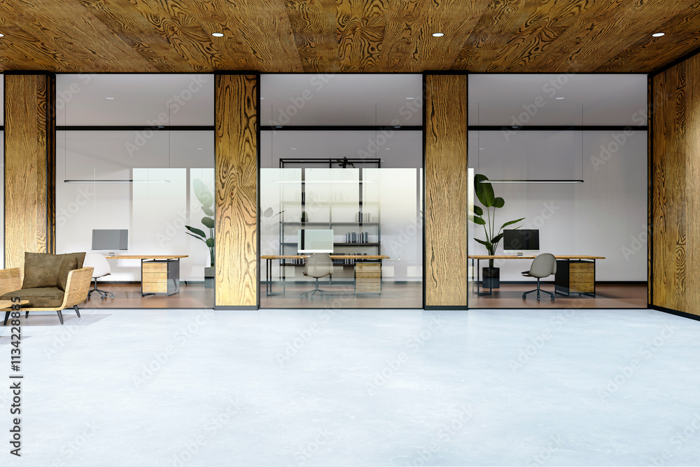 Modern office interior with wooden partitions, glass walls, and contemporary furnishings in a bright, spacious, corporate setting. 3D Rendering