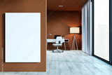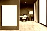 Modern workspace with white desk, chair, and lamp in cozy room with large window, brown walls, and blank white panel. 3D Rendering