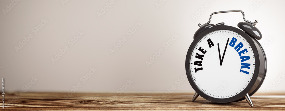 Alarm clock with "Take a Break" message on wooden surface, symbolizing time management and the importance of breaks in daily routines. 3D Rendering