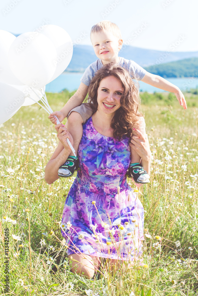 Mother with son are having fun in chamomile field