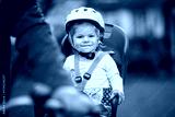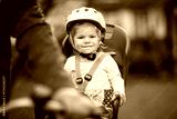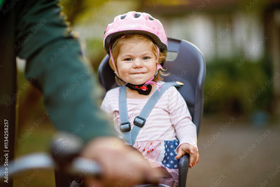 A smiling toddler girl wearing a pink helmet sits securely in a bicycle child seat, ready for a ride. The background is blurred, focusing on the child joyful expression