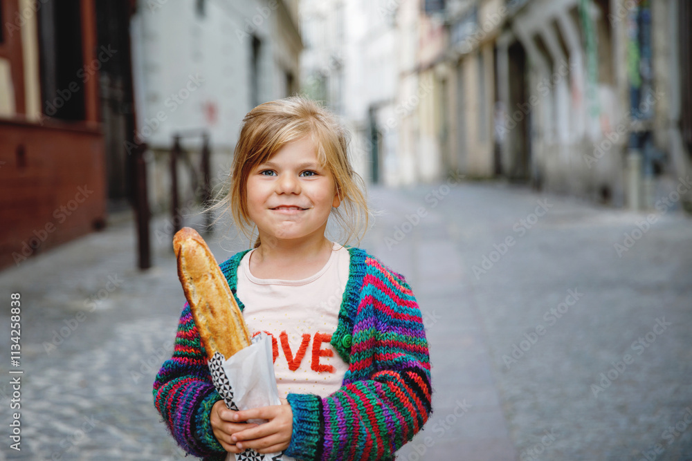Adorable little preschool girl with fresh French baguette on the street side of the city. Happy small child in Paris, France.
