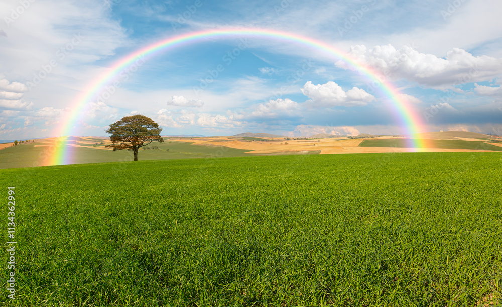Beautiful landscape with green grass field and lone tree in the background amazing rainbow